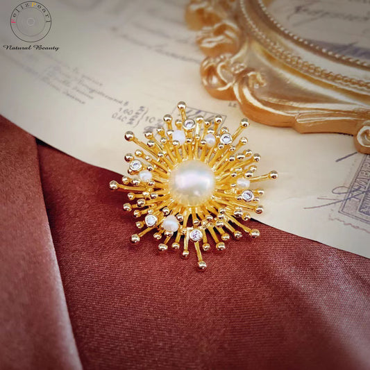 Cubic Zirconia Dandelion. Copper Pearl Brooch Gift