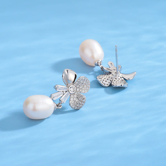 Cubic Zirconia Flower Pearl Earring Setting-S925 Sterling Silver